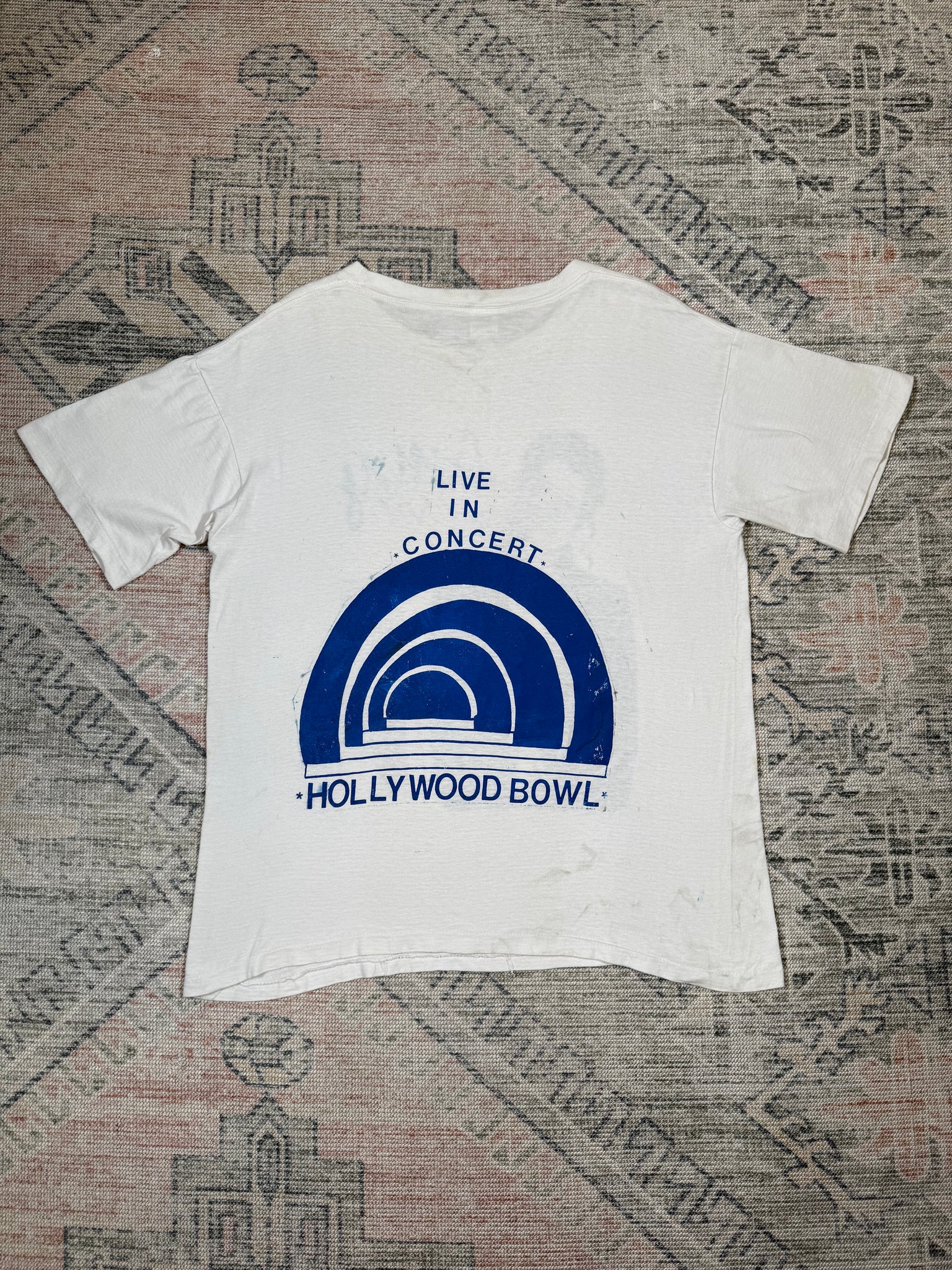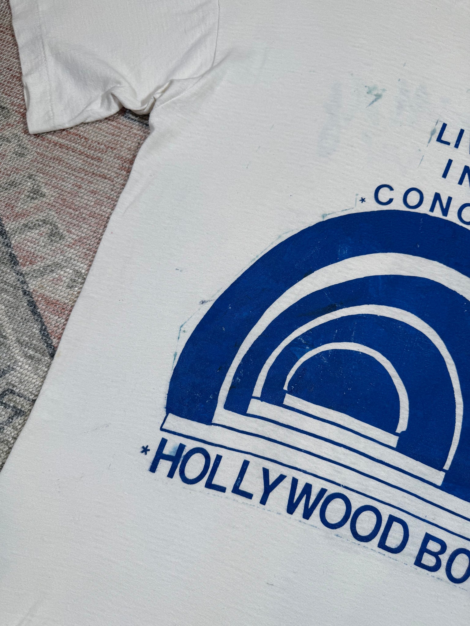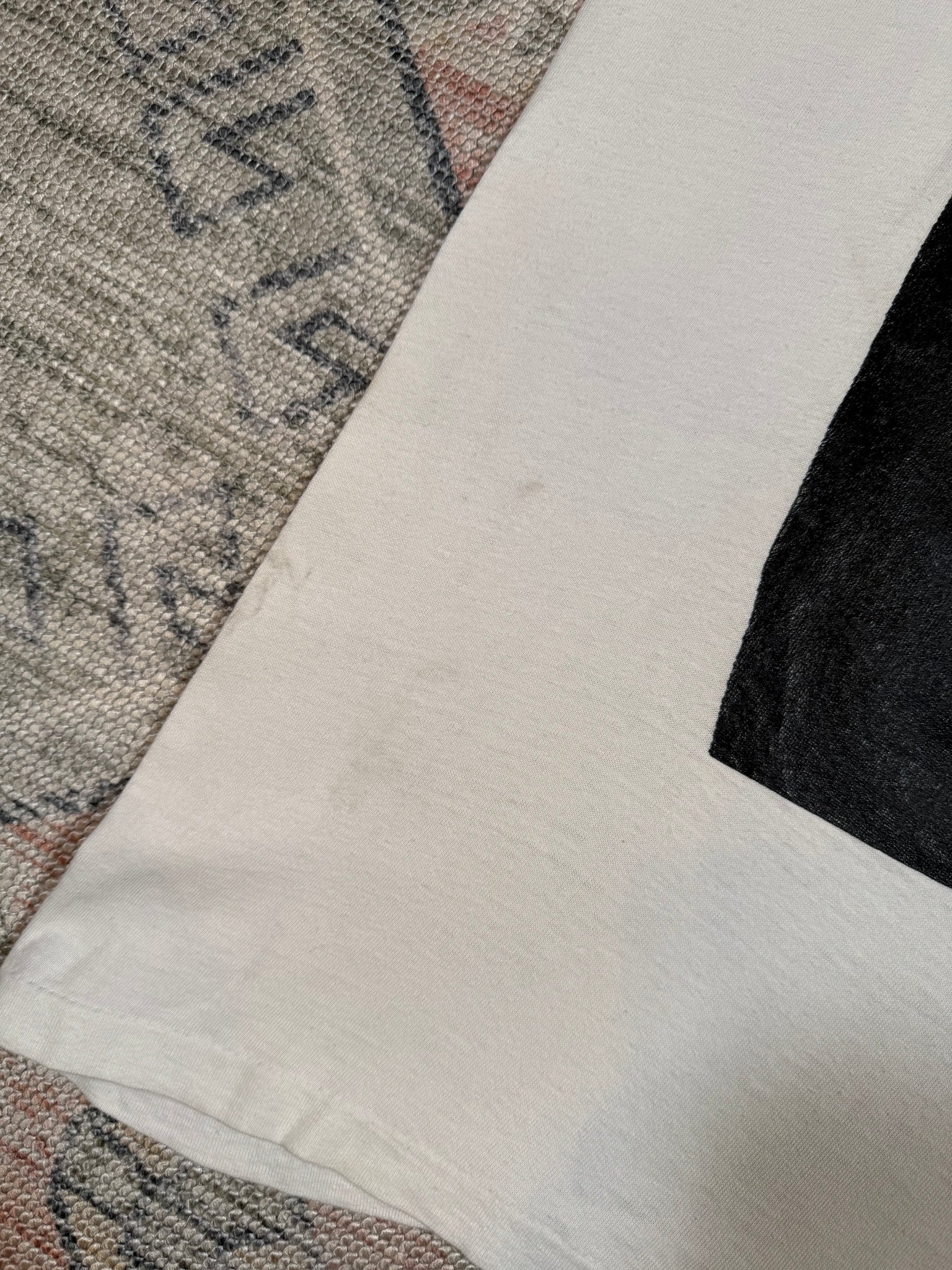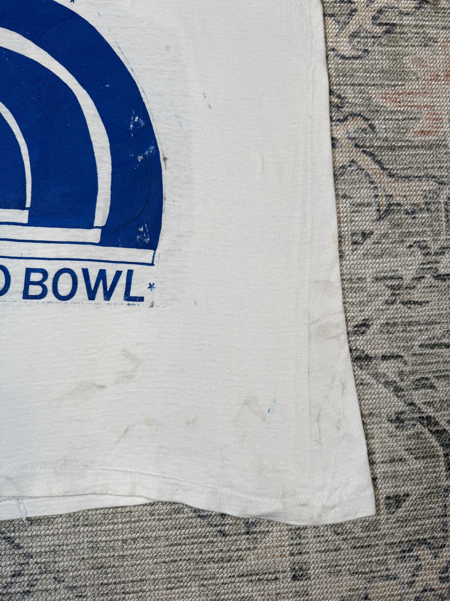 Has marks throughout and paint from hand screen printing, shown