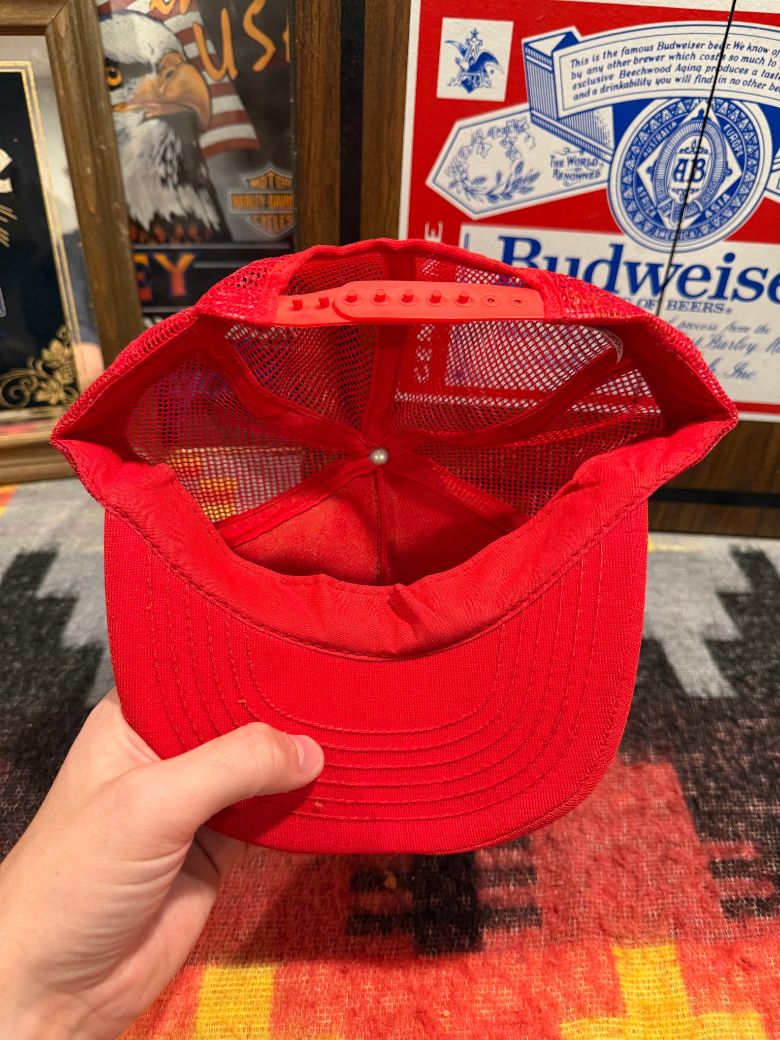 Foam is gone from the inside so the top of hat is limp. Brim is somewhat brittle also, has a bend in it, shown